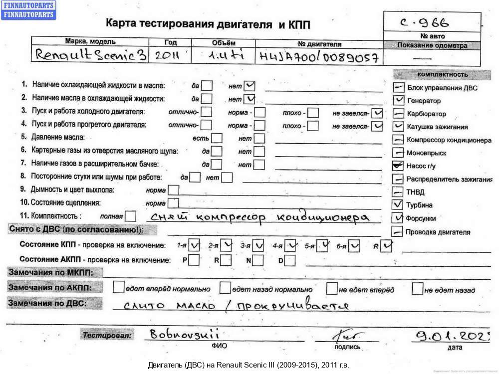 Ханты-Мансийск | 2012 | 8201201884, 2012, 1.6л, Дизель, DCI, R9M402, R9MA402C060841, 8201201884, Минивэн, красный, Фото не актуально, с запчасти отделены: Компрессор кондиционера, ТНВД, Турбина, Генератор, R9MA402C060841 | - | С, прокручивается, состояние ГРМ - нормально, поддон - нормально, клапанная крышка - нормально, эмульсия - нет, | |||